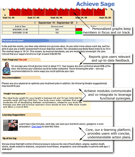 Achieve Server | Achieve Sage | Achieve Core | Achieve Connect ![]() Achieve Sage Technology Health just got smarter. Sage is the heart of the Savvyhealth Achieve system. Developed by physicians, nurses, and health care professionals, Sage software analyzes and interprets current and past physiologic user data to provide real-time, patient-specific feedback about actual health status based on up-to-the-minute standard-of-care clinical guidelines. Sage feedback is matched with content from Achieve Core, our proprietary specialty e-learning platforms and virtual community resources. Sage also monitors compliance, providing customized and relevant information for a broad spectrum of patients. Modules that talk to each other. Imagine that! Savvyhealth has developed Sage modules for diabetes and asthma. In the near future, Sage modules for nutrition, hypertension, HIV/AIDS and pregnancy/early childhood development will become available. An important feature engineered into each module is the ability to share information and data between disease/wellness states. Diabetics will be able to plan, monitor and improve their glucose control through better nutrition. Patients with hypertension and diabetes will be able to receive integrated and personalized self-care plans tailored exclusively for both problems. The possibilities are endless. To find out more about Savvyhealth products and services, please contact our Business Development staff. |